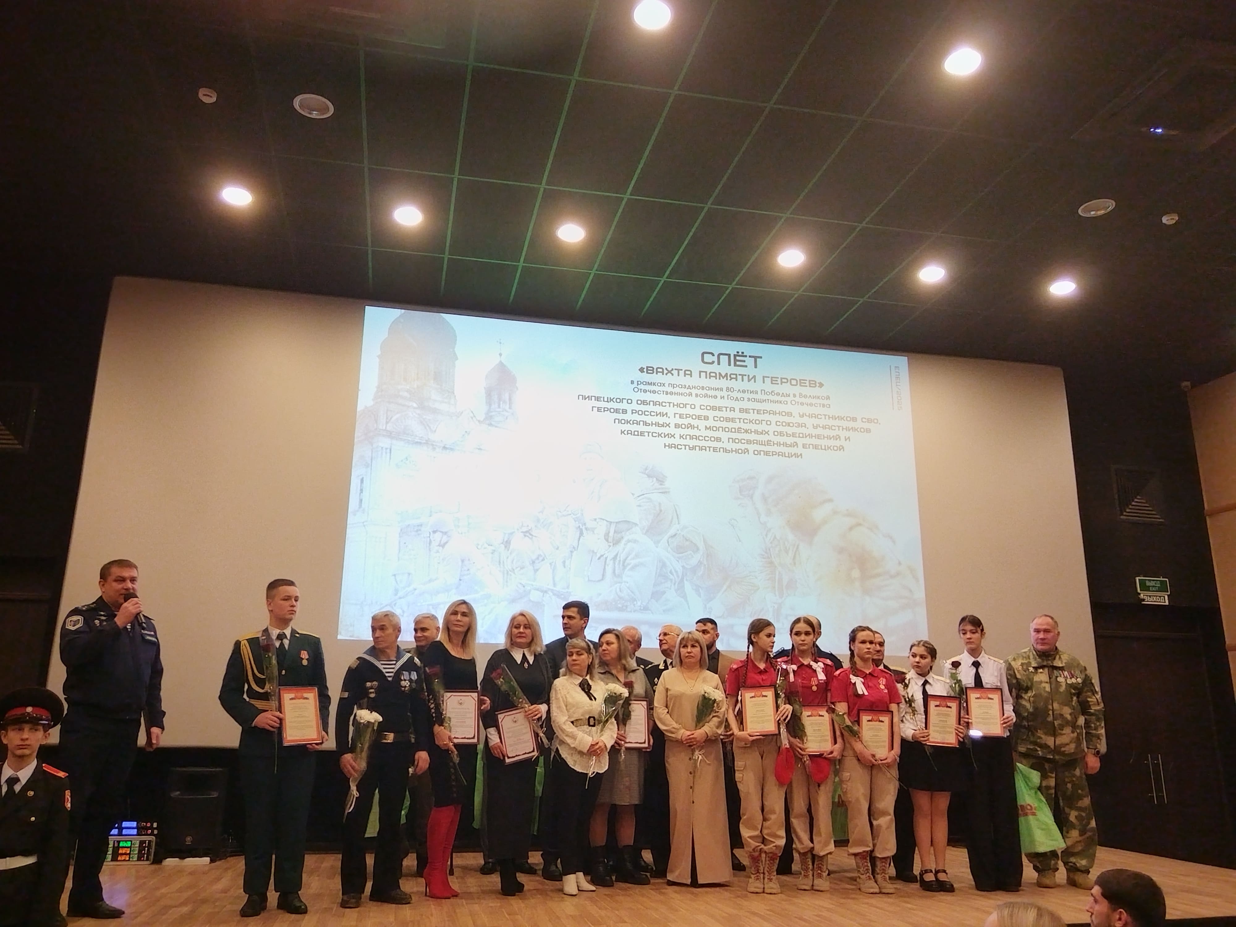 Слет продолжился в кинотеатре «Прожектор», где к участникам с приветственными словами обратились глава городского округа город Елец Вячеслав Жабин, председатель Совета депутатов городского округа город Елец Виктор Никонов, Герой Советского Союза Юрий Чурилов и председатель Липецкого областного Совета ветеранов Леонид Гусев. В рамках слета состоялось награждение благодарственными письмами и памятными подарками участников СВО, родителей погибших участников СВО, волонтеров, представителей молодежных объединений и кадетских классов.